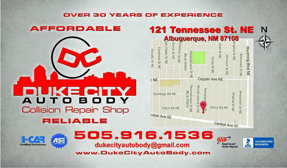 Duke City Auto Body and Collision Center is located at 121 Tennessee St NE, Albuquerque, NM 87108, this is a Auto body shop that can help you get back on the road fast, they have one of the many auto repair shops in New Mexico, USA listed under our car repair shops.
