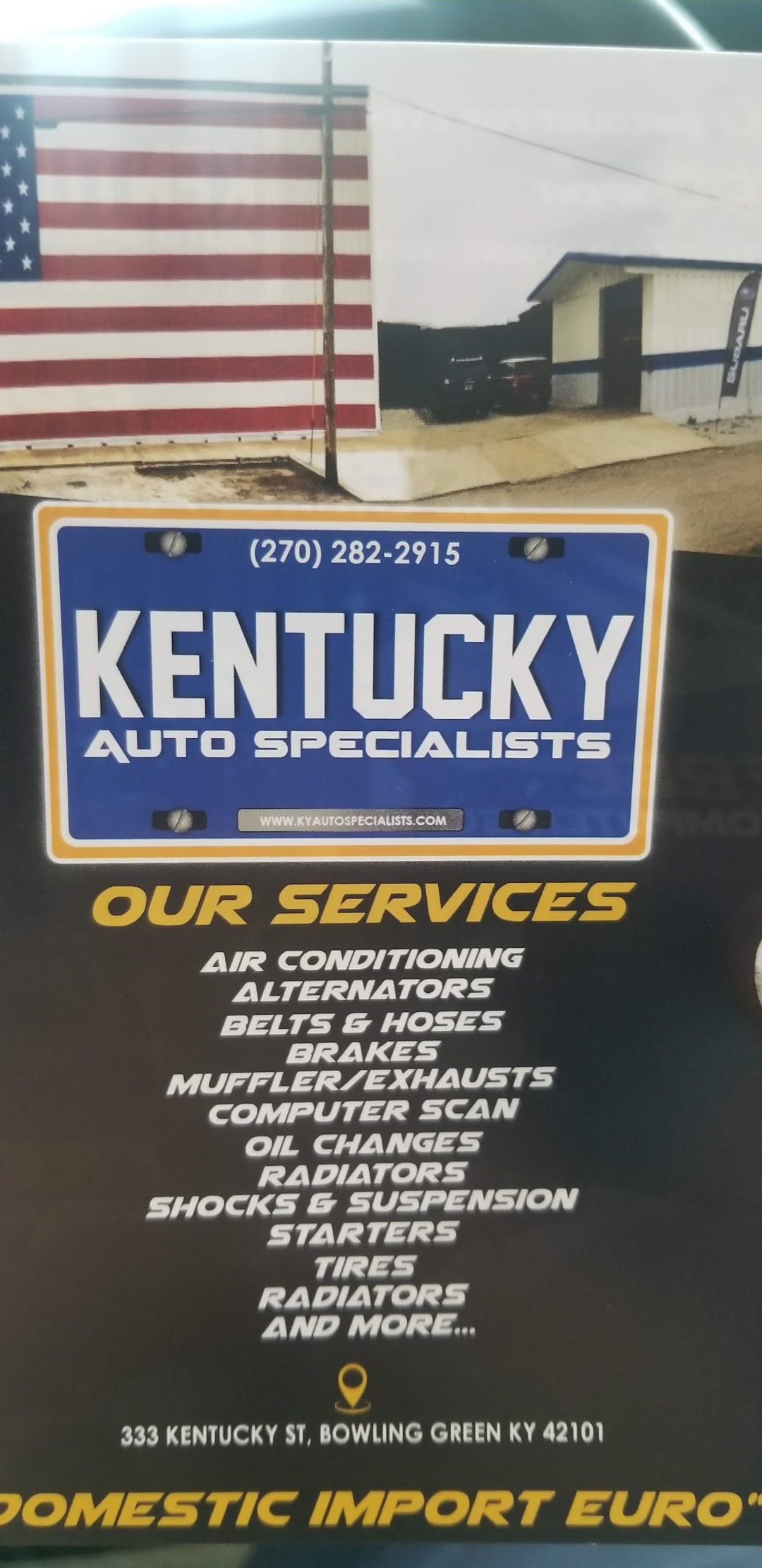 Kentucky Auto Specialist is located at 333 Kentucky St, Bowling Green, KY 42101, this is a Mechanic that can help you get back on the road fast, they have one of the many auto repair shops in Kentucky, USA listed under our car repair shops.